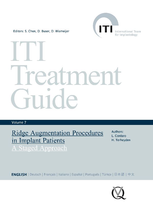 Volume 7 of the ITI Treatment Guide series provides clinicians with the latest evidence-based information on the techniques and materials utilized for ridge augmentation. An up-to-date analysis of the current evidence is based in part on the proceedings of the ITI Consensus Conferences in Stuttgart (2008) and Bern (2013) and a review of the current literature. Twelve clinical cases demonstrate the planning and treatment principles required to successfully rehabilitate patients with varying degrees of ridge atrophy.